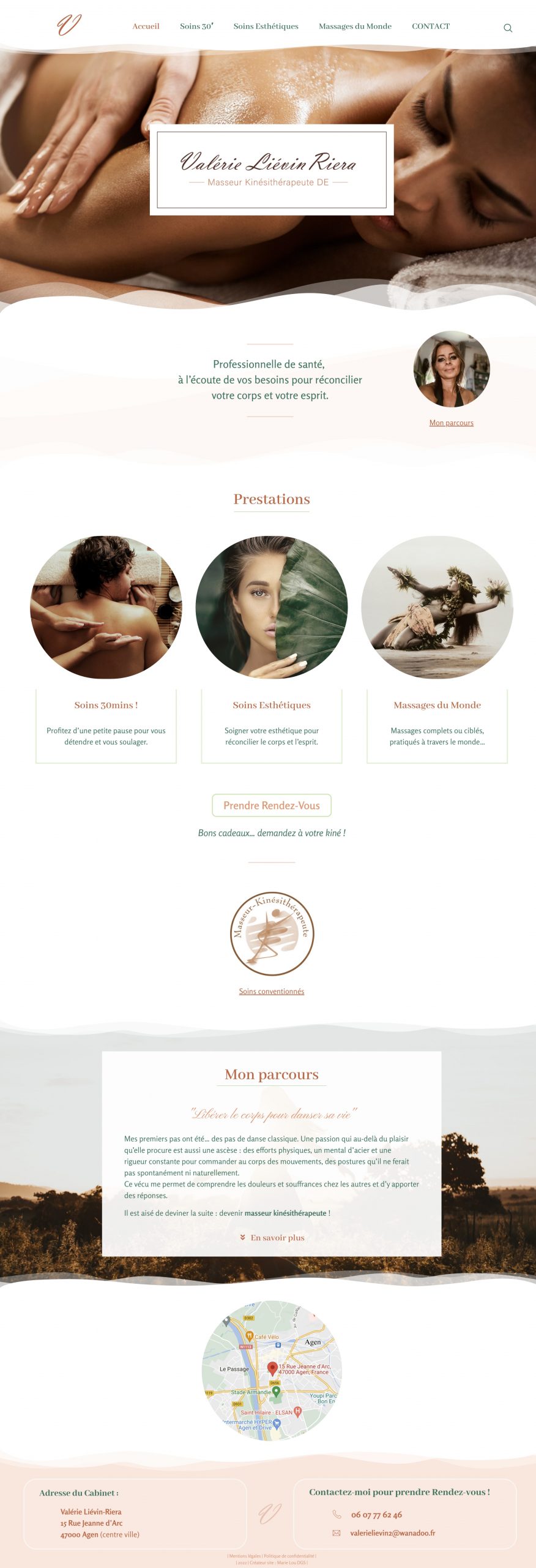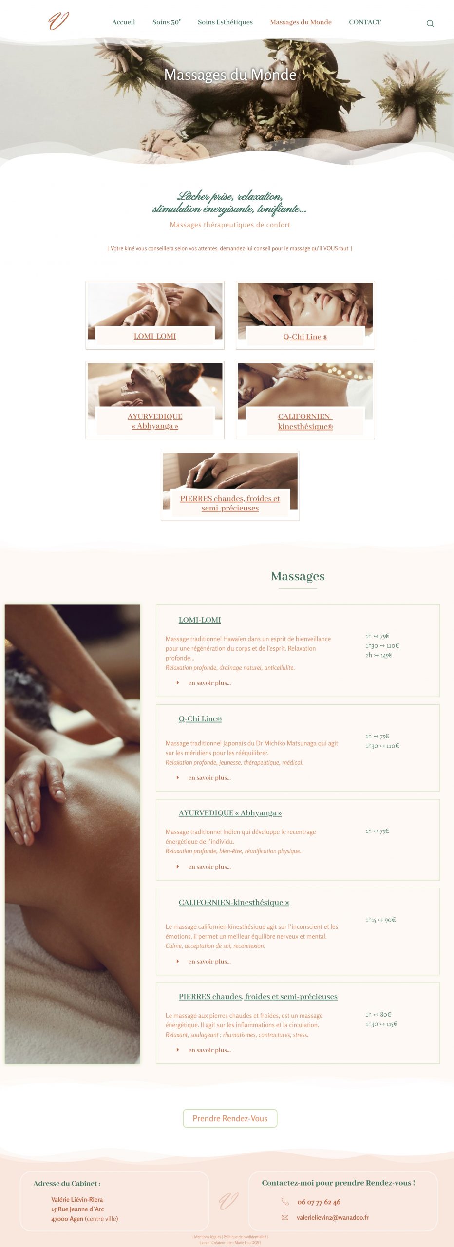 La Kinésithérapeute -Valérie Liévin Riera- souhaitait faire un site internet pour attirer davantage de clientèle sur ses différents massages du monde et soins esthétiques.